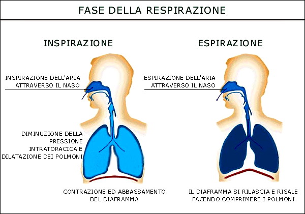 L’inspirazione è un processo attivo perché l’aria che penetra attraverso naso, bocca, glottide, trachea, deve, per poter giungere nei bronchi, bronchioli, e alveoli, vincere la resistenza rappresentata dall’elasticità del polmone, che tende a retrarsi, e la resistenza al passaggio nelle vie aeree. Al termine dell’inspirazione, i muscoli intercostali esterni ed il diaframma (muscolo a cupola che separa la cavità toracica da quella addominale) si rilasciano e, per retrazione elastica della parete toracica e dei polmoni, si ha l’espirazione passiva.