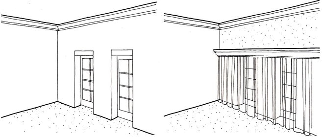 P.es.: nei vecchi appartamenti, l'altezza del soffitto può essere abbassata con una cornice (per nascondere il bastone delle tende) posta sull'intera lunghezza della parete in corrispondenza della fine della finestra o del balcone, unitamente ad un tendaggio sospeso.